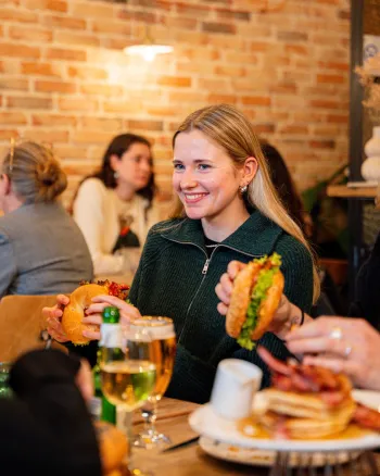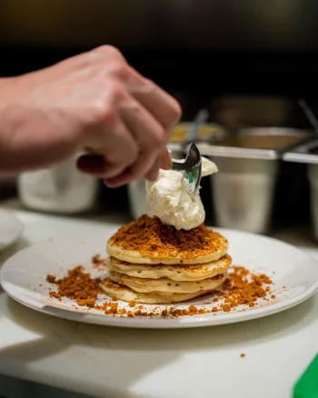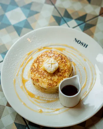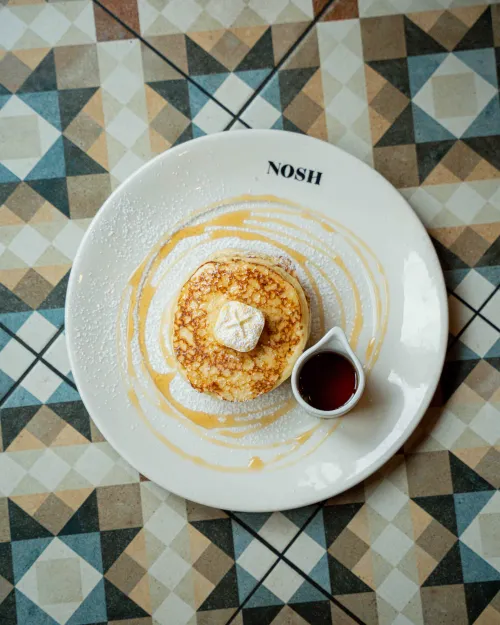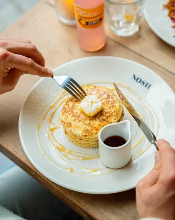 Of je ze nu stapelt met vers fruit & maple siroop, kiest voor de verrassende twist van onze hangover pancakes met spek en ei, of geniet van dé strawberry cheesepancakes — een echte Nosh klassieker — ze zijn perfect voor een luie ochtend, een zoete lunch of gewoon… omdat het kan.