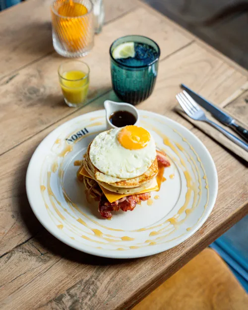 Of je ze nu stapelt met vers fruit & maple siroop, kiest voor de verrassende twist van onze hangover pancakes met spek en ei, of geniet van dé strawberry cheesepancakes — een echte Nosh klassieker — ze zijn perfect voor een luie ochtend, een zoete lunch of gewoon… omdat het kan.